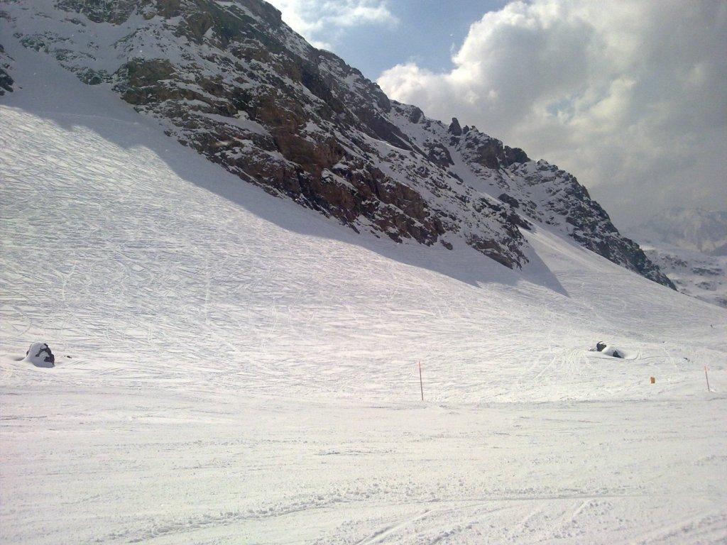 ai piedi del Cervino sembra di essere gia' a fine aprile.... nonostante un caldo atroce direi situazione ancora molto buona come qualita' della neve in zona Bontadini/Ventina/Plateau Rosa a Valtournanche, molto piu' esposta ed anche meno aperta come vallata, classiche situazioni di fine stagione con neve lastrata granitica la mattina che squaglia inevitabilmente dall'una in poi... a fatica e con un po' di attenzione a fine giornata si riesce ancora cmq a scendere in paese sci ai piedi... notevoli gli sforzi dei gattisti per tenere in ordine il tutto |