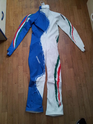 descrizione oggetto: Tuta da gara da sci della nazionale italiana di sci alpino. Nuova, cerniera posteriore, taglia XL. Omologata FIS, con bollino sul fondo della gamba.